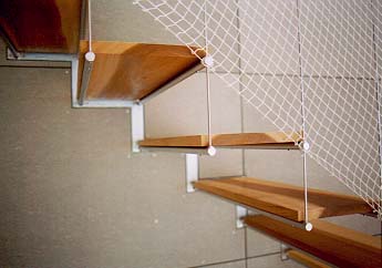 ■この階段の特徴は、階段としての機能を満たすエレメントのみで成り立っていることである。それ以外に構造的に設けたものは何も無く機能上必要なエレメントを工夫して構造材として利用しているに過ぎない。段板・手摺・手摺子の全てを構造で使っているのである。 |