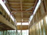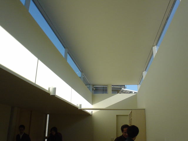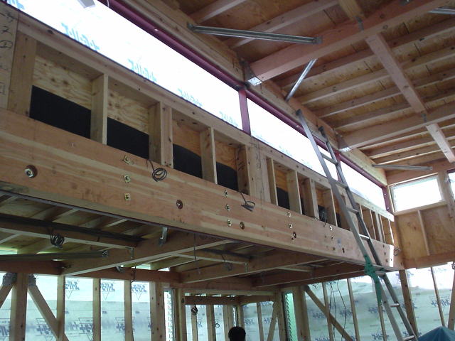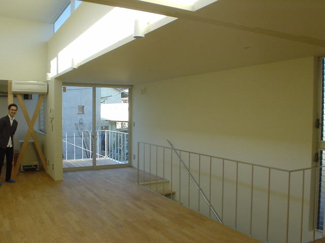 2階リビング天井を1段高くしてハイサイドによる採光としている.水平力はフラットバーの方立てと上下の溝形鋼によるラーメン構造として荷重を下部に伝達させている.