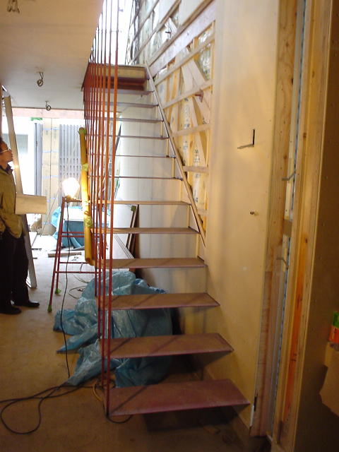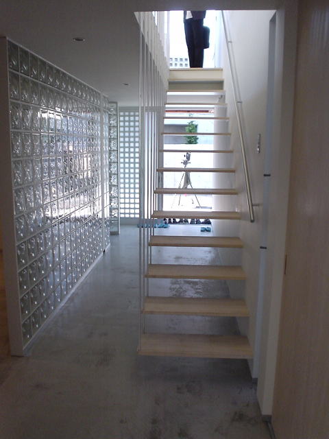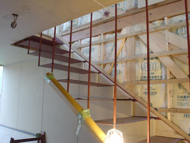 階段は,壁端は壁内に内蔵された支持材に固定され,他端は手すり子で吊る構造とした.手すり子の材料は13mm角の鋼棒.