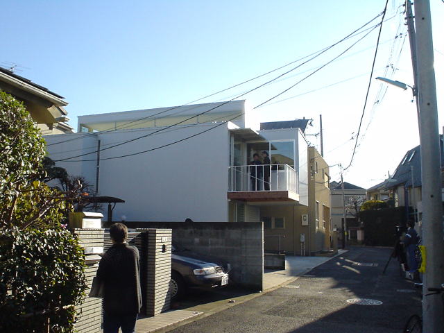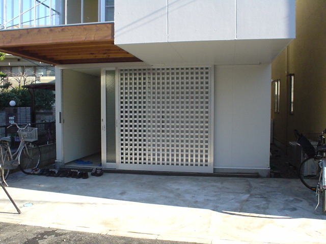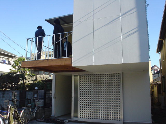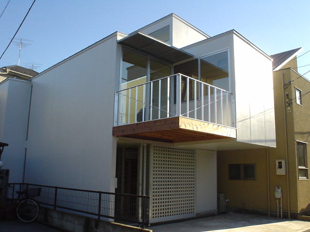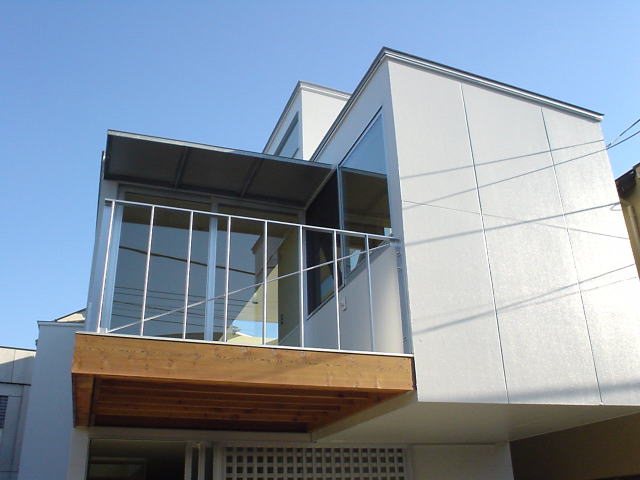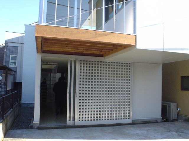 道路側に駐車スペースを確保するために2階部分が2,275mmオーバーハングしている.耐力壁内部を筋交等により補強し片持ち形式で持ち出した.