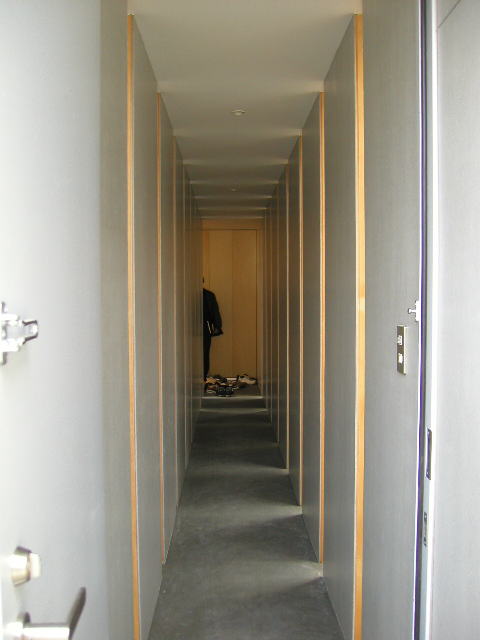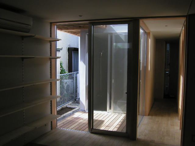アプローチ部分を巾900mmの細長い土間空間として,スリット開口を規則的に設けて演出している.とても面白い空間だ.