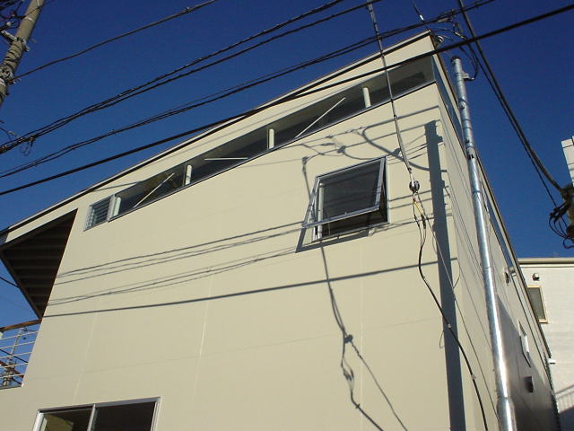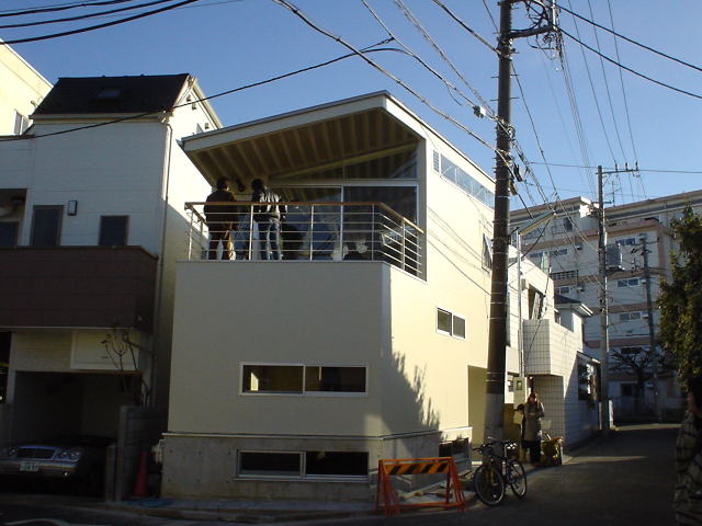 データ 所在地 東京都中野区 用途 専用住宅 階数 地下1階,地上2階 構造 地下1階:鉄筋コンクリート造 1・2階:木造 屋根:鉄骨造 杭・基礎 直接べた基礎 小さな住宅であるが,RC造・木造・鉄骨造が混在し且つ変形な敷地にスキップフロアと複雑な要素が網羅された建物である.設計には非常に苦労した作品. 構造的な特徴は折版の屋根.折版を長辺方向に渡しデッキテラスまで持ち出している.張弦梁で折版を支える.